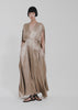 $1,195A study in fluidity and restraint. Cut in luminous silk, this floor length dress is shaped by a clean V neckline and a softly draped cape back that falls in one continuous line. A self belt defines the waist, releasing into gentle pleats through the skirt for movement and quiet shine in Sesame.